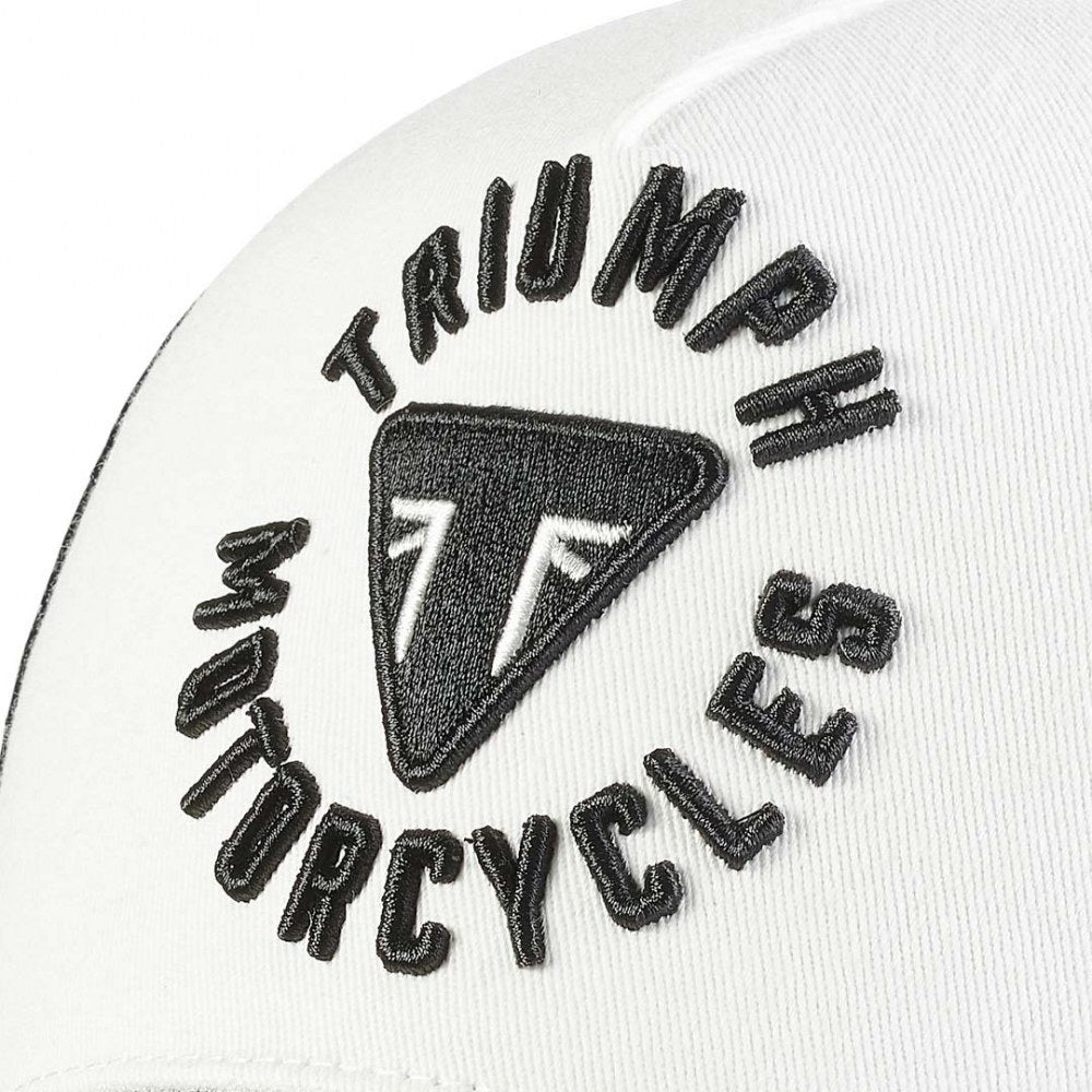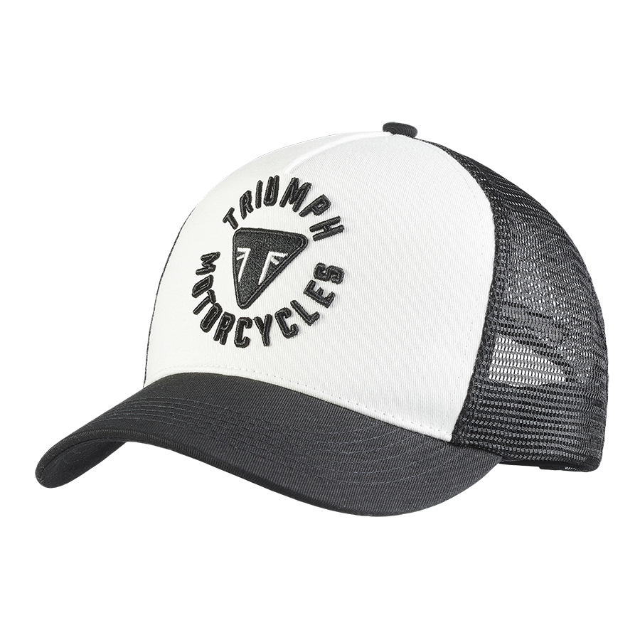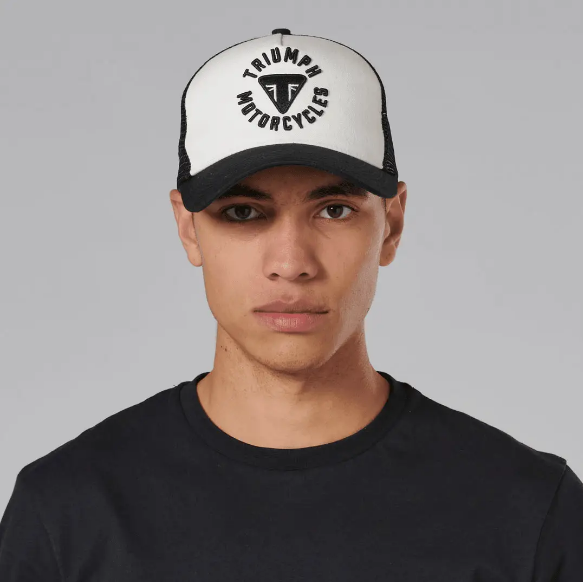 Classico Berretto in vero stile camionista di colore Bianco e Nero, con logo Triumph racchiuso nella scritta "Triumph Motorcycles" nella parte frontale !!