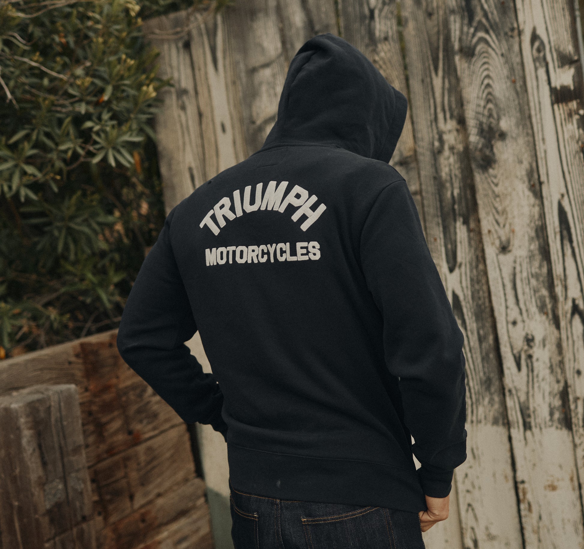 - Con zip frontale e patch Triumph sull'orlo inferiore.
