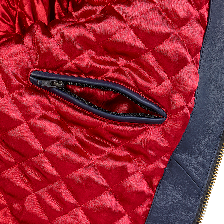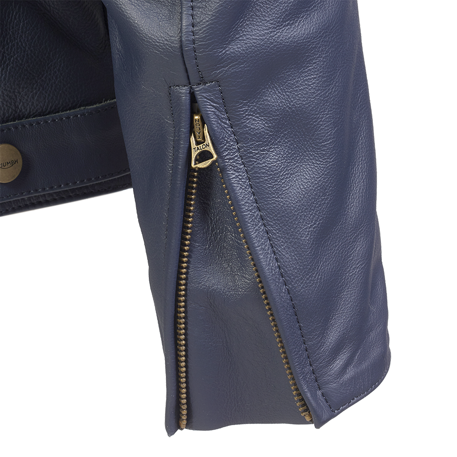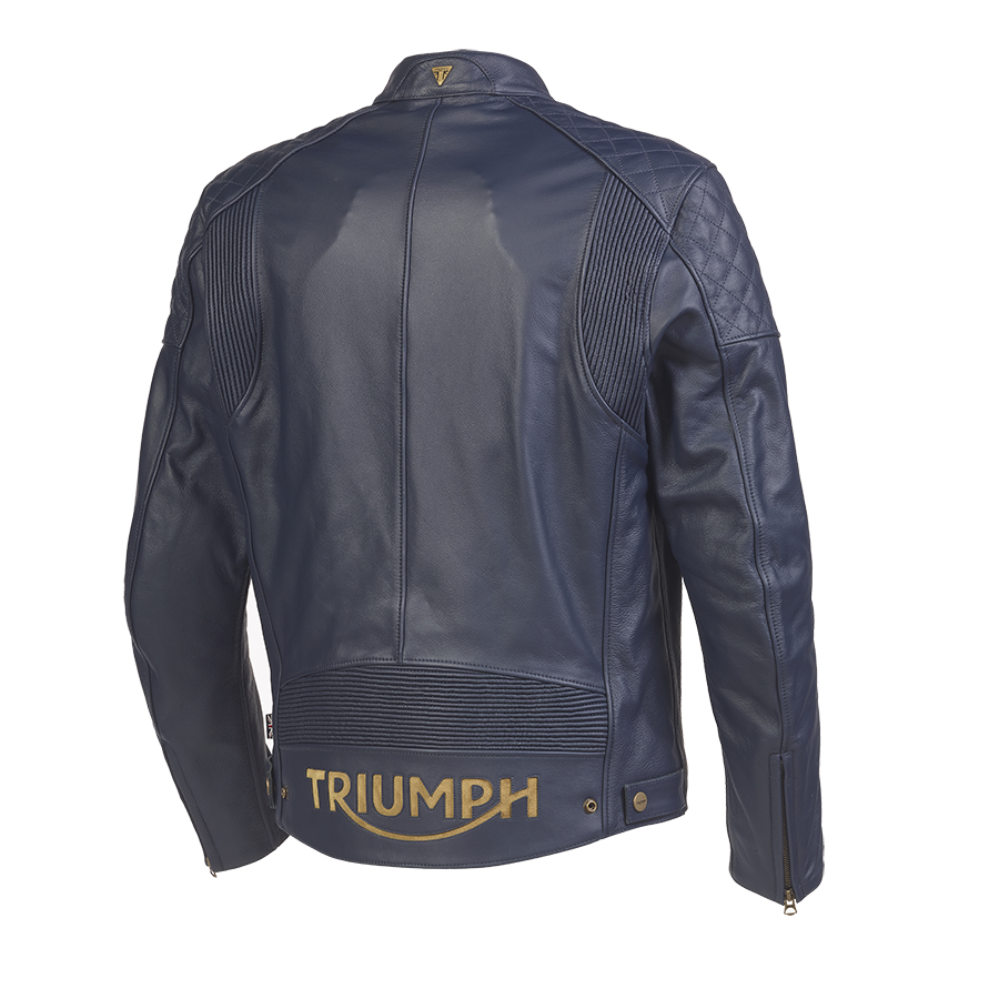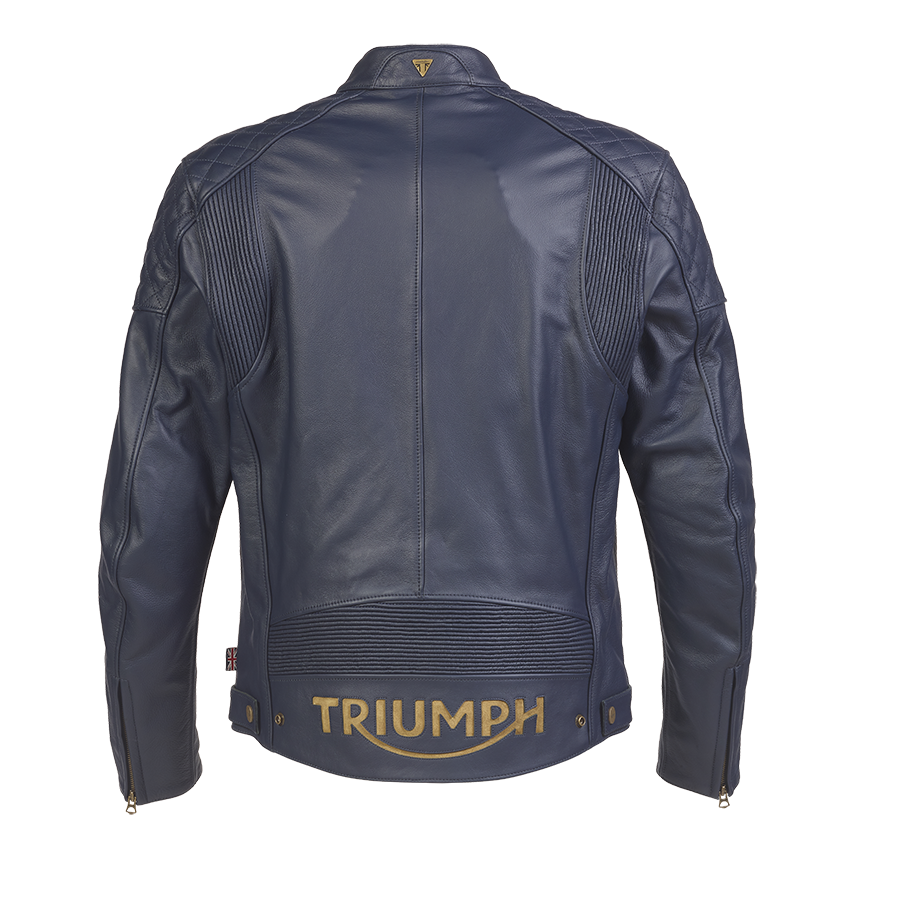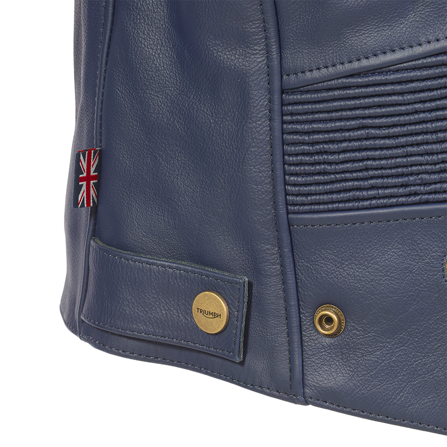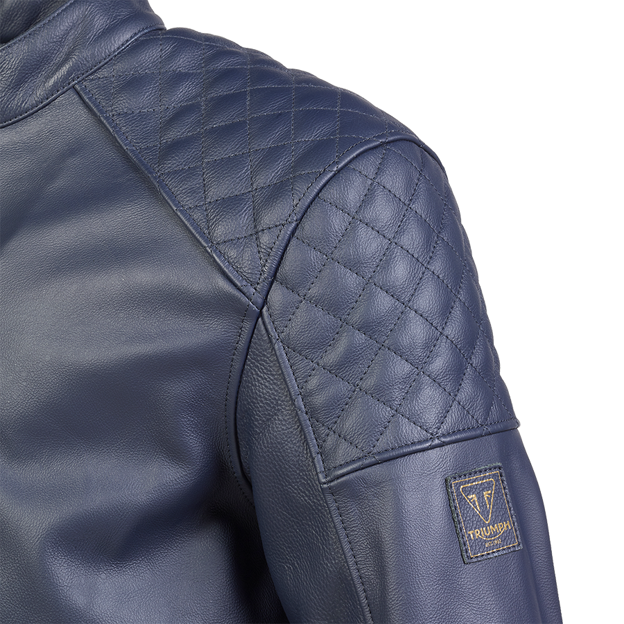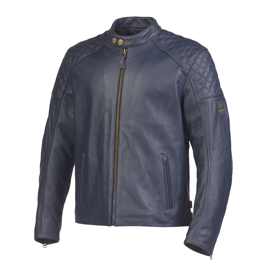 Giacca con un design classico in pelle pieno fiore blu, con protezioni D3O® rimovibili, pannelli trapuntati, tasche nella parte inferiore del corpo e dettaglio logo dorato applicato sul retro nella parte inferiore della schiena.