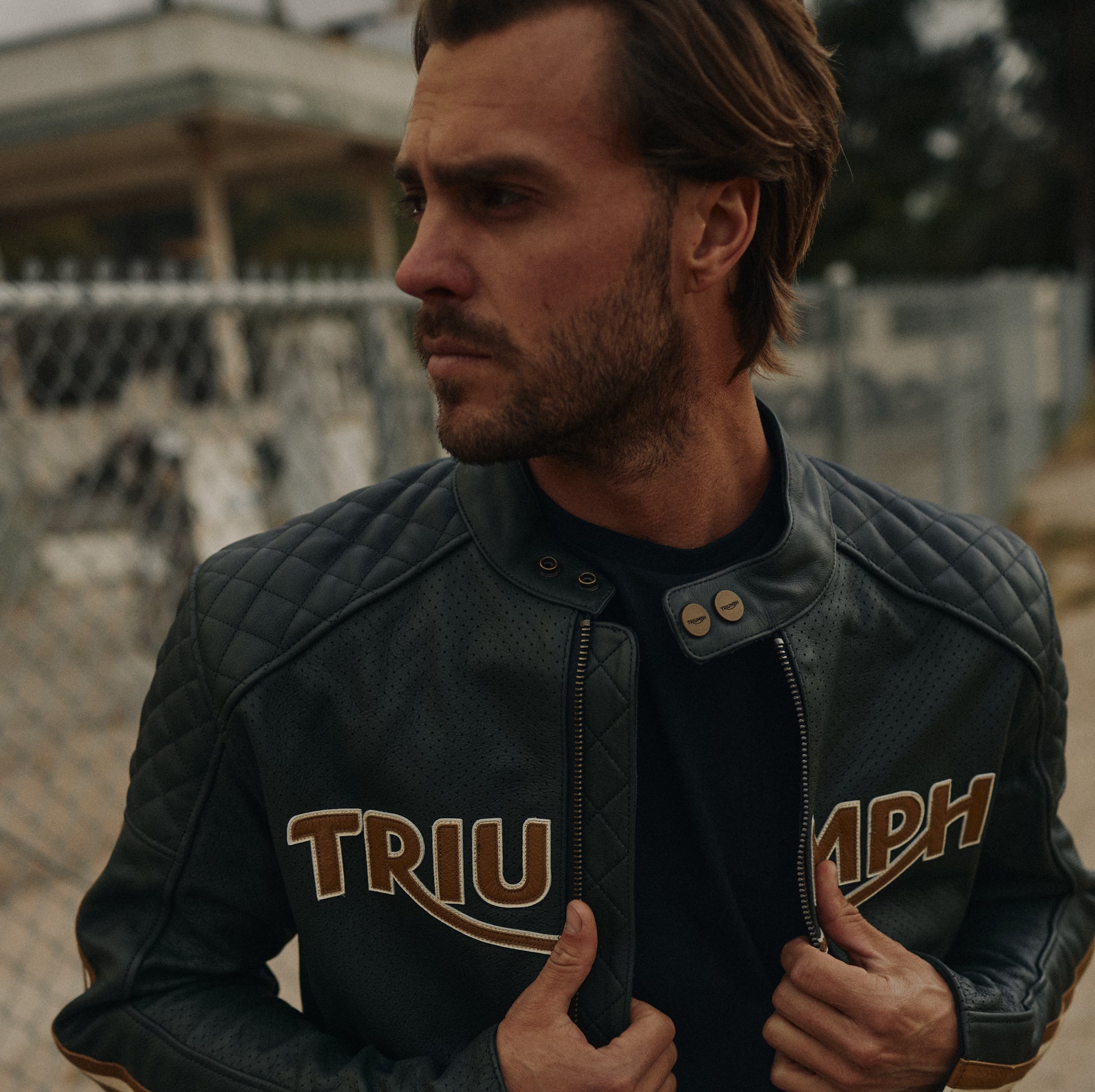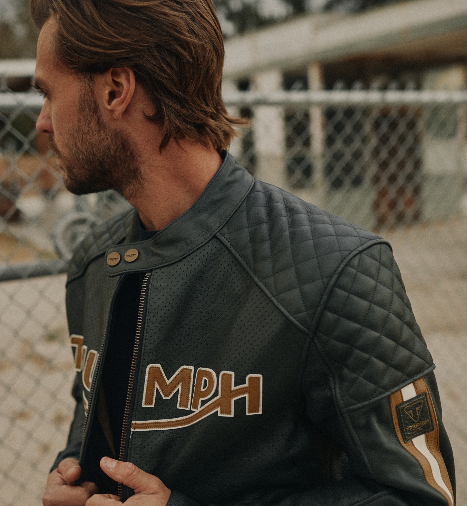 Il petto presenta un prominente dettaglio del logo Triumph color oro, doppie strisce sportive lungo le maniche e l'iconica toppa con logo Triumph cucita a mano.