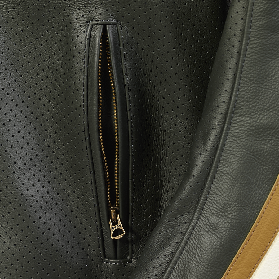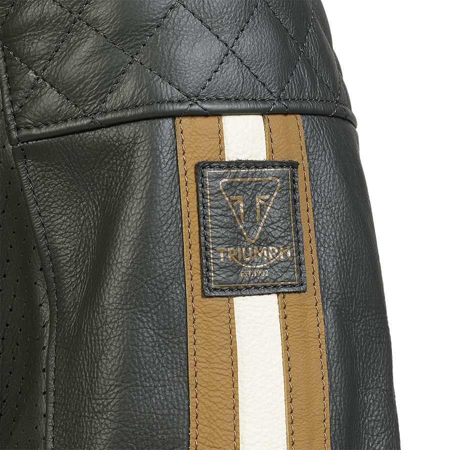 La Giacca da moto in pelle verde Triumph Braddan Air Race è una classica giacca da motociclista con collo da pilota, realizzata in morbida pelle verde di prima qualità con spalle e parte superiore del braccio trapuntate.