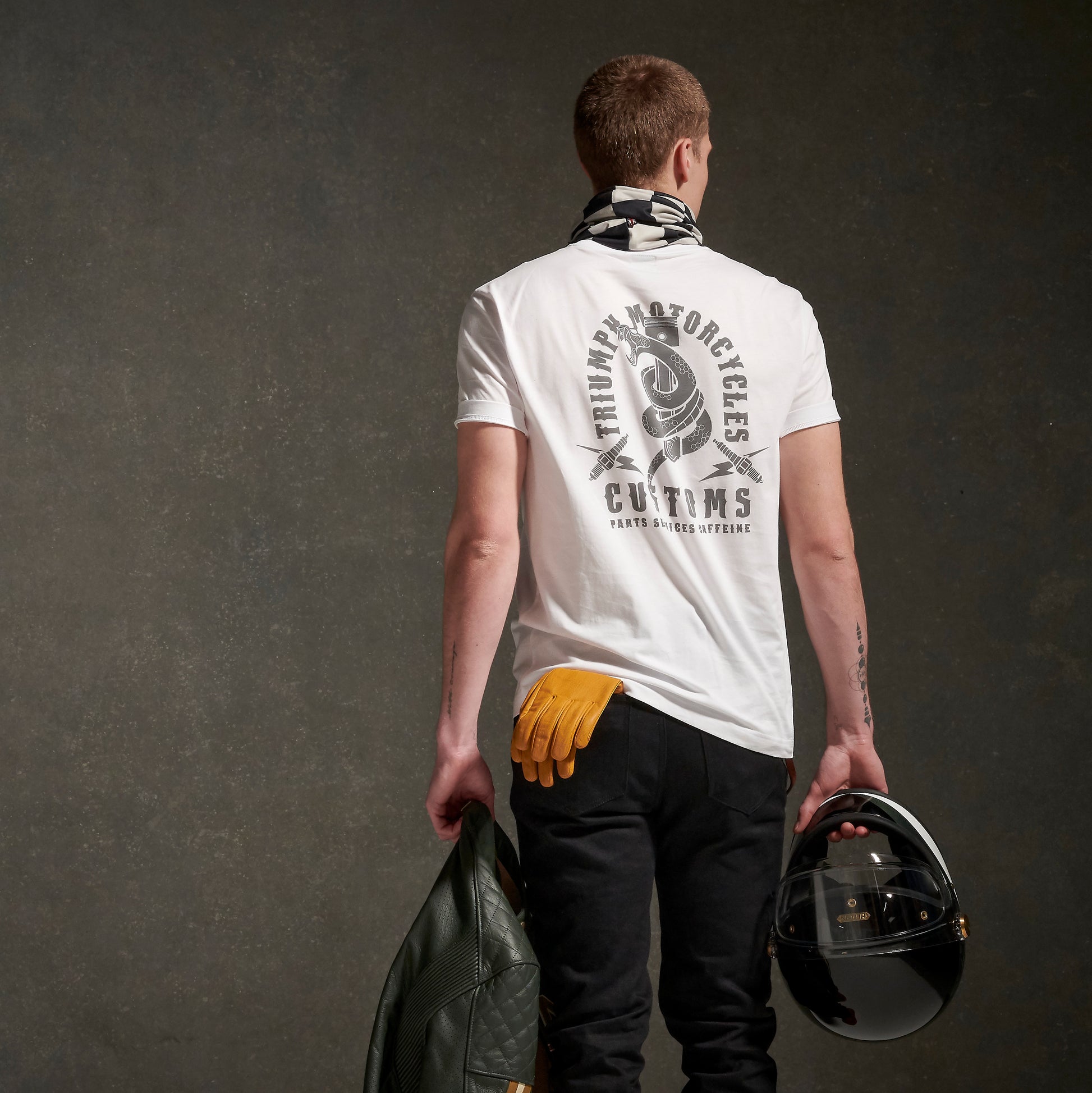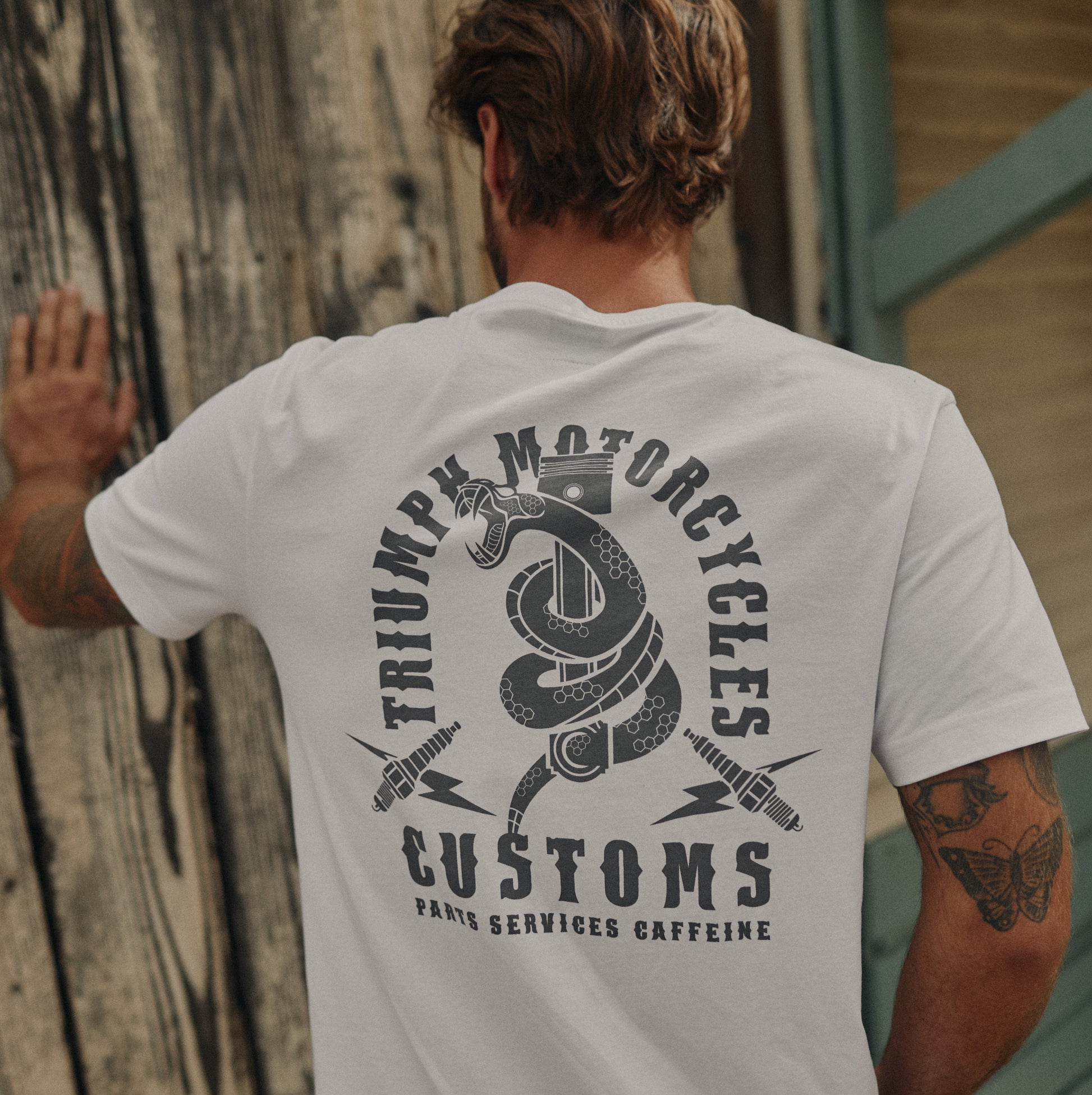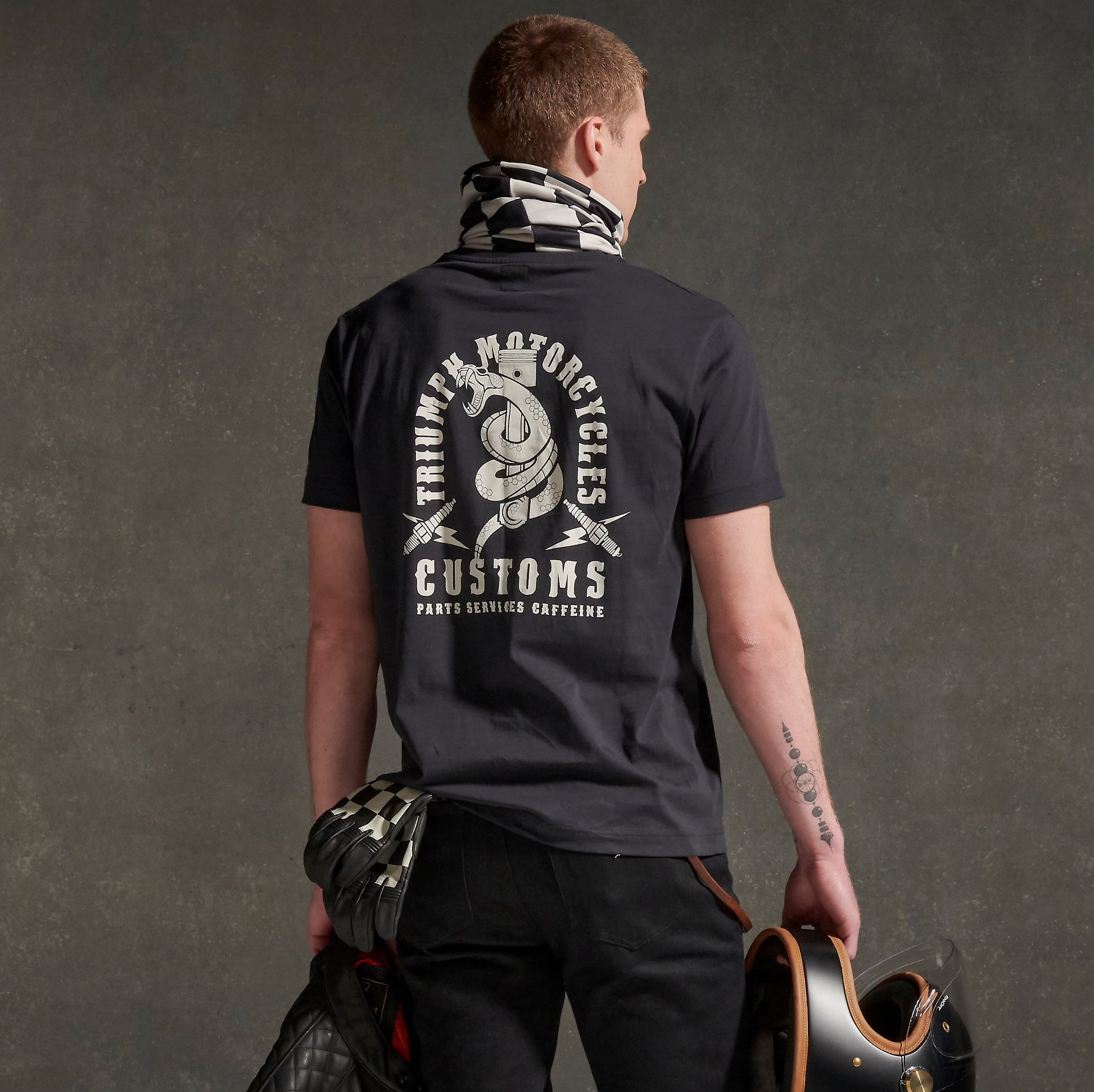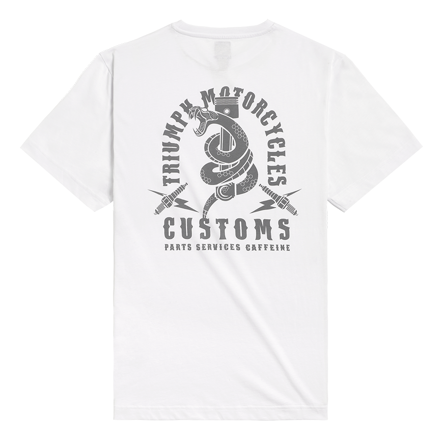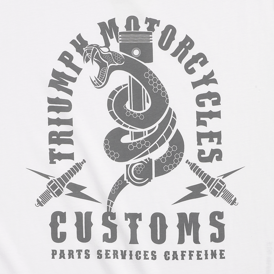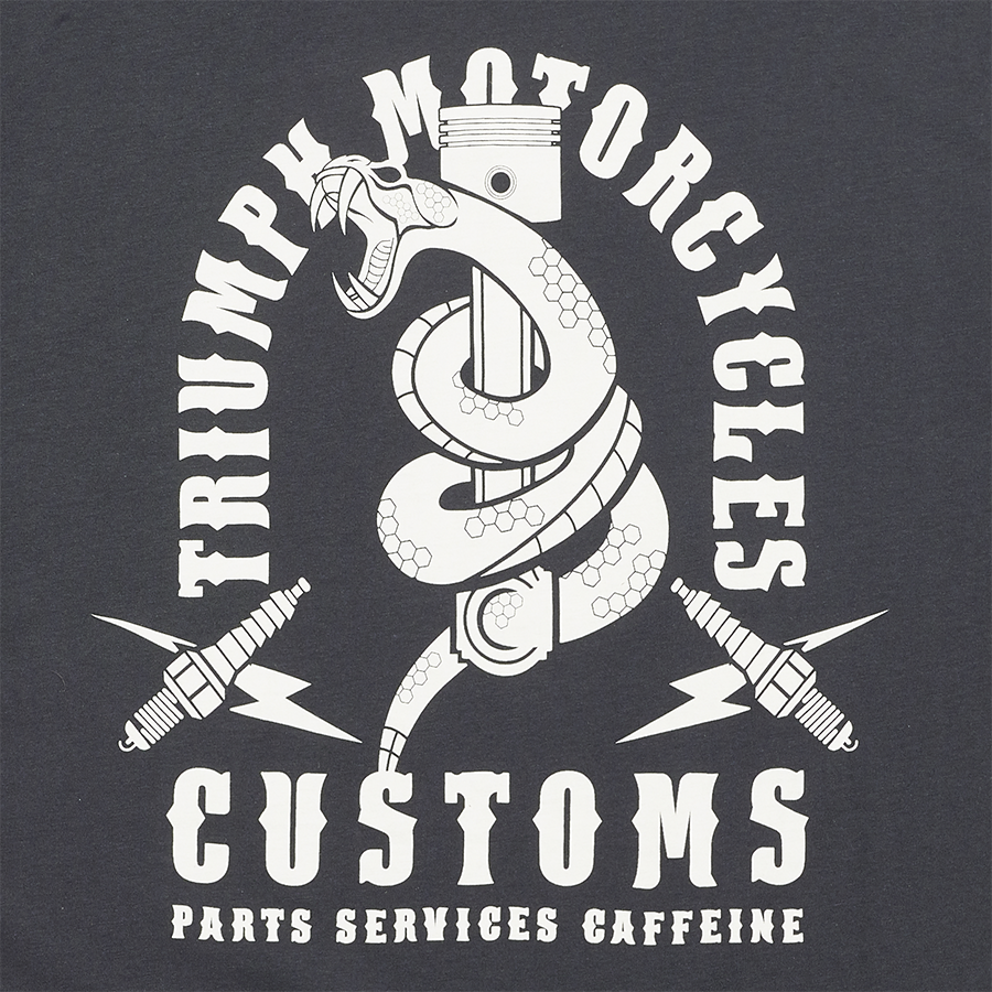 - Con logo Triumph intrecciato e accattivante scritta ad arco "Triumph Motorcycles Customs" sul retro con serpente e disegno del pistone.