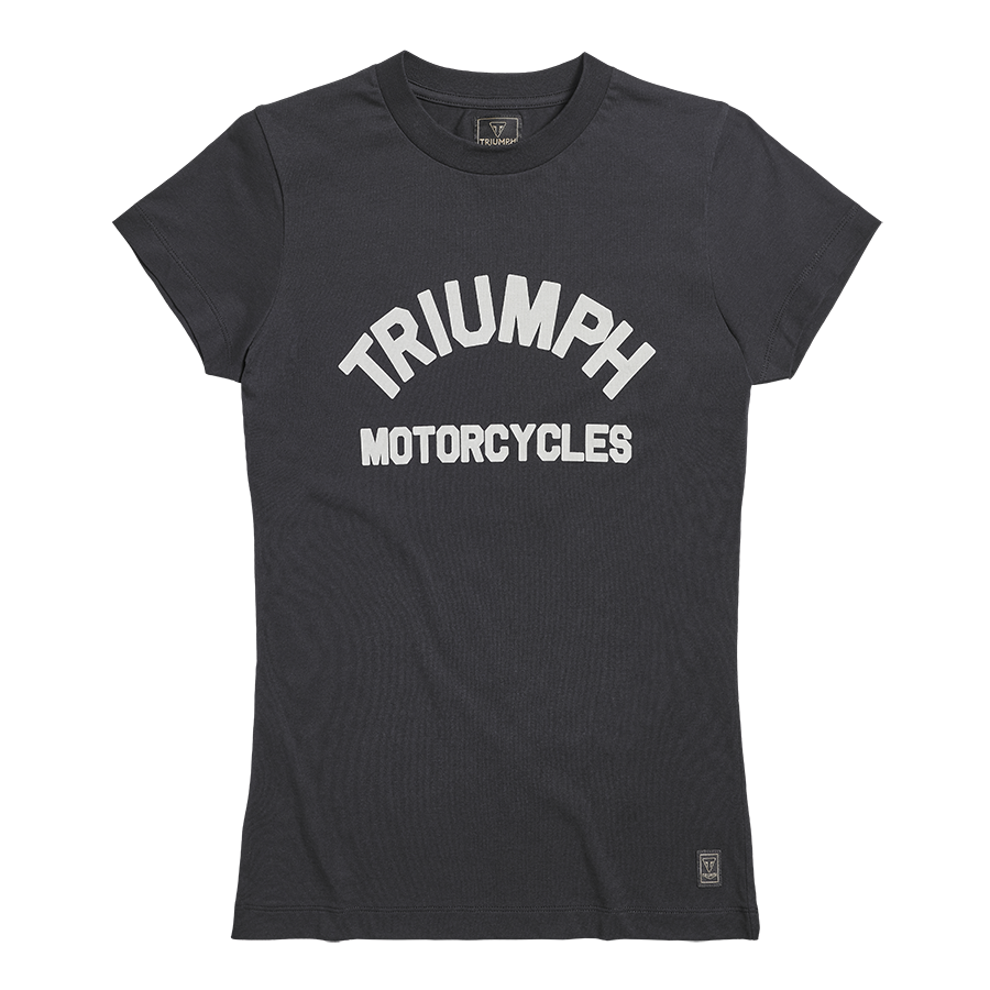 Maglia Donna a maniche corte in colorazione Jet Black con logo Triumph ricamato e patch con marchio Triumph sull'orlo inferiore.