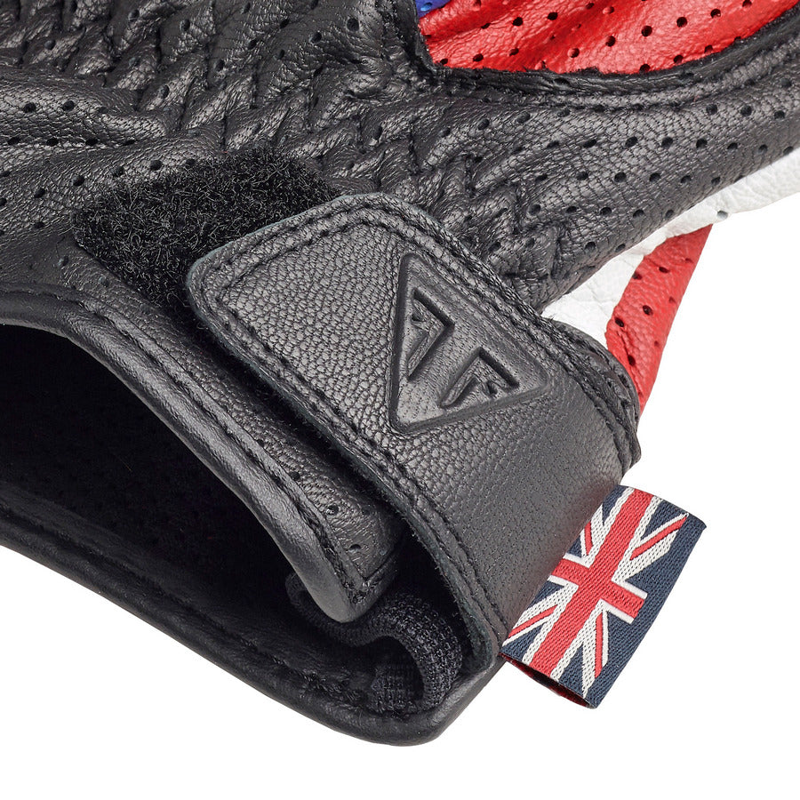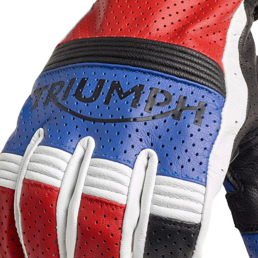 Comodi Guanti Triumph realizzati in magnifica Pelle traforata dal design accattivante che unisce le colorazioni rossa, bianca, nera e blu in un connubio perfetto per distinguersi nell'iconico stile Triumph !!