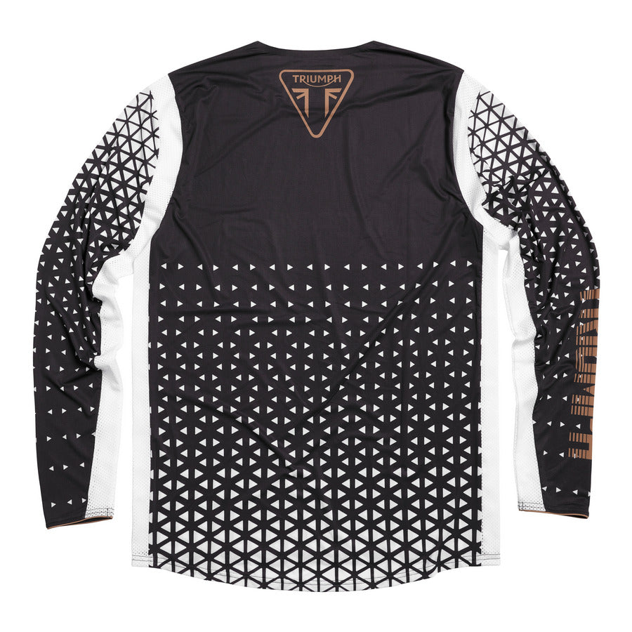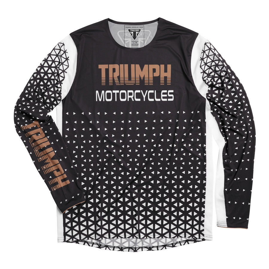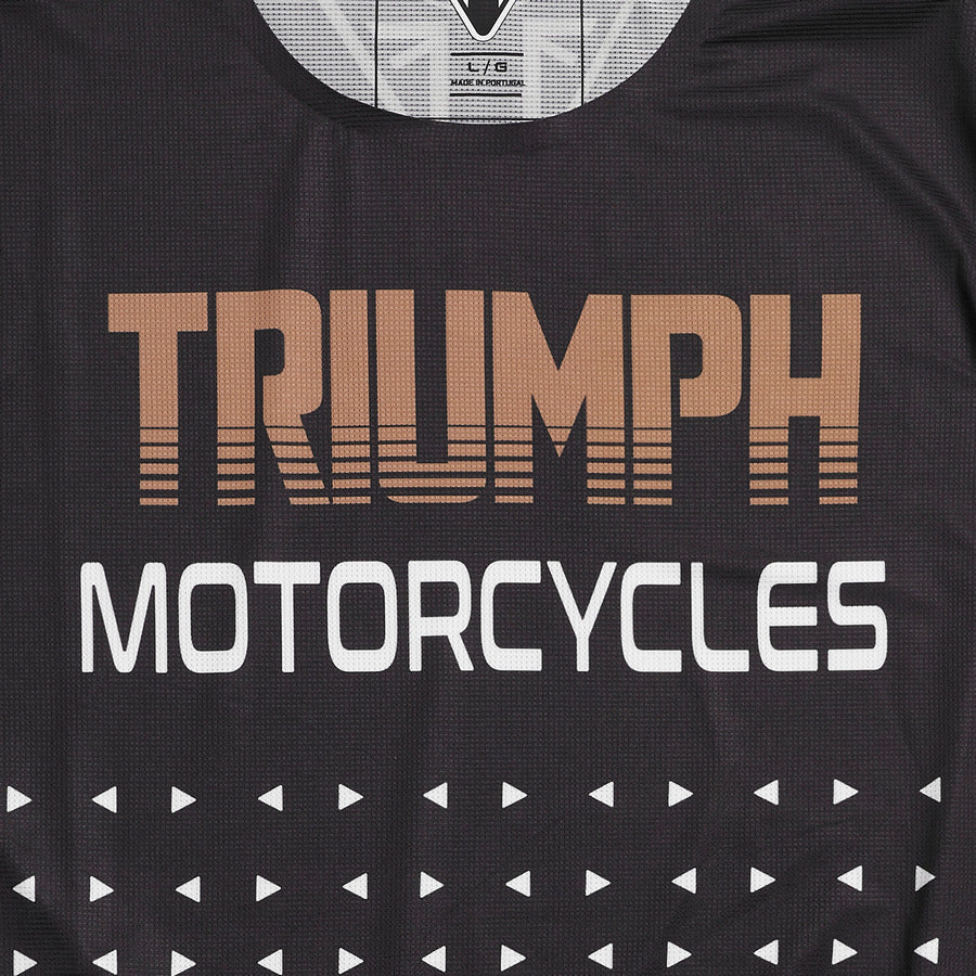 - Con stampa sublimata stilizzata su tutta la superficie con scritta "Triumph Motorcycles" in oro sul petto.